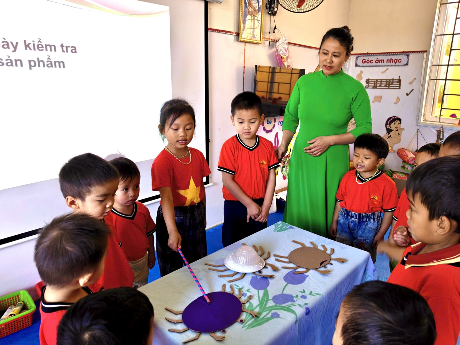 Thực hiện kế hoạch số 17/KH-MNHM Kế hoạch sinh hoạt chuyên môn năm học 2025–2026 và nhằm tiếp tục đổi mới phương pháp tổ chức các hoạt động giáo dục theo định hướng lấy trẻ làm trung tâm và phát triển toàn diện cho trẻ mầm non, ngày 26/12/2025 Trường Mầm non Họa Mi đã tổ chức Chuyên đề cấp trường “Ứng dụng phương pháp giáo dục STEAM trong thực hiện Chương trình Giáo dục mầm non”áp dụng“Quy trình 5E” do cô giáo Trần Thị Thảo thực hiện và “Quy trình EDP” do cô giáo Phạm Thị Hải thực hiện triển khaitạilớp mẫu giáo ghép 3–4–5 tuổi bản Na Nghè. Tham dự chuyên đề có Ban giám hiệu nhà trường cùng toàn thể giáo viên trong trường, đây là hoạt động sinh hoạt chuyên môn có ý nghĩa thiết thực, tạo điều kiện để đội ngũ giáo viên được nghiên cứu, trao đổi và chia sẻ kinh nghiệm trong việc vận dụng phương pháp giáo dục STEAM vào thực tiễn giảng dạy, đặc biệt trong điều kiện dạy học tại điểm trường Nà Nghè với 100% đều là trẻ em dân tộc thiểu số. Tại chuyên đề, giáo viên đã tập trung làm rõ nội dung, ý nghĩa và cách thức vận dụng quy trình 5E (Gắn kết – Khám phá – Giải thích – Mở rộng – Đánh giá) và quy trình EDP (Xác định vấn đề – Lên ý tưởng – Thiết kế – Thử nghiệm – Cải tiến) thông qua các hoạt động học cụ thể: Khám phá con cua (5E), Làm con cua bằng bìa cứng (EDP), phù hợp với đặc điểm tâm sinh lý và khả năng nhận thức của trẻ lớp mẫu giáo ghép 3–4–5 tuổi. Các hoạt động được thiết kế theo hướng lấy trẻ làm trung tâm, gắn với cuộc sống hằng ngày của trẻ em bản Na Nghè, tận dụng nguyên vật liệu sẵn có tại địa phương. Giáo viên đã linh hoạt tổ chức cho trẻ ở các độ tuổi khác nhau cùng tham gia vào quá trình trải nghiệm, quan sát, thảo luận, thử nghiệm và sáng tạo, qua đó giúp trẻ từng bước hình thành tư duy khoa học, kỹ năng giải quyết vấn đề, kỹ năng hợp tác và giao tiếp. Thông qua việc ứng dụng phương pháp giáo dục STEAM, trẻ được khuyến khích mạnh dạn nêu ý kiến, chia sẻ suy nghĩ, chủ động tham gia các hoạt động học tập; đồng thời phát triển sự tự tin, tính tích cực và hứng thú trong học tập. Giáo viên đóng vai trò là người tổ chức, định hướng, hỗ trợ, tạo môi trường học tập an toàn, thân thiện để trẻ được học thông qua trải nghiệm thực tế. Chuyên đề đã góp phần nâng cao chất lượng sinh hoạt chuyên môn trong nhà trường, hỗ trợ giáo viên đổi mới phương pháp giảng dạy, đồng thời khẳng định vai trò và hiệu quả của phương pháp giáo dục STEAM trong việc nâng cao chất lượng chăm sóc, giáo dục trẻ mầm non tại Trường Mầm non Họa Mi trong năm học 2025–2026. Dưới đây là một số hình ảnh ghi lại hoạt động của cô và bé: