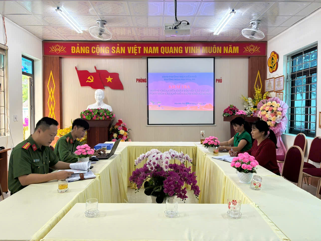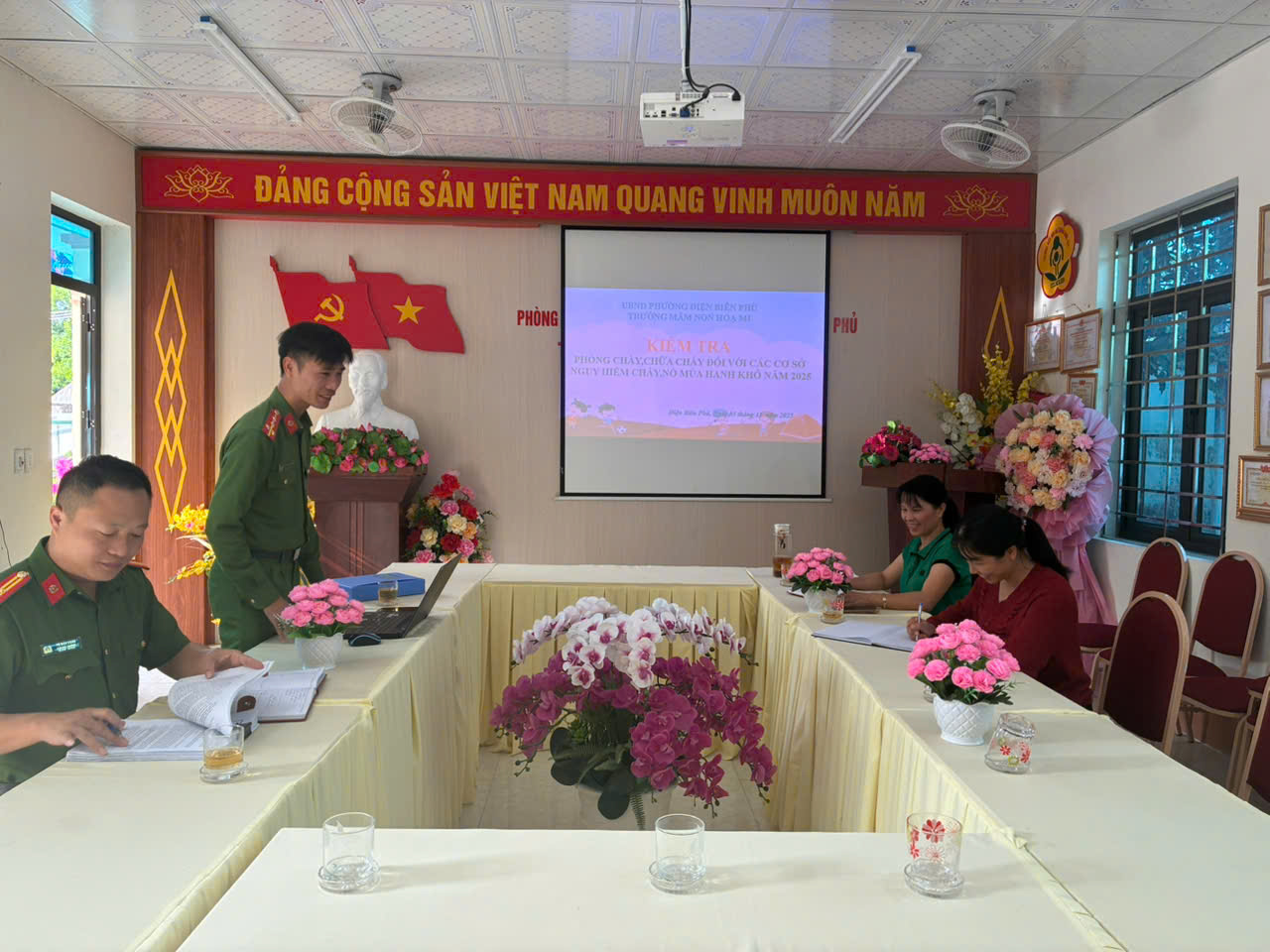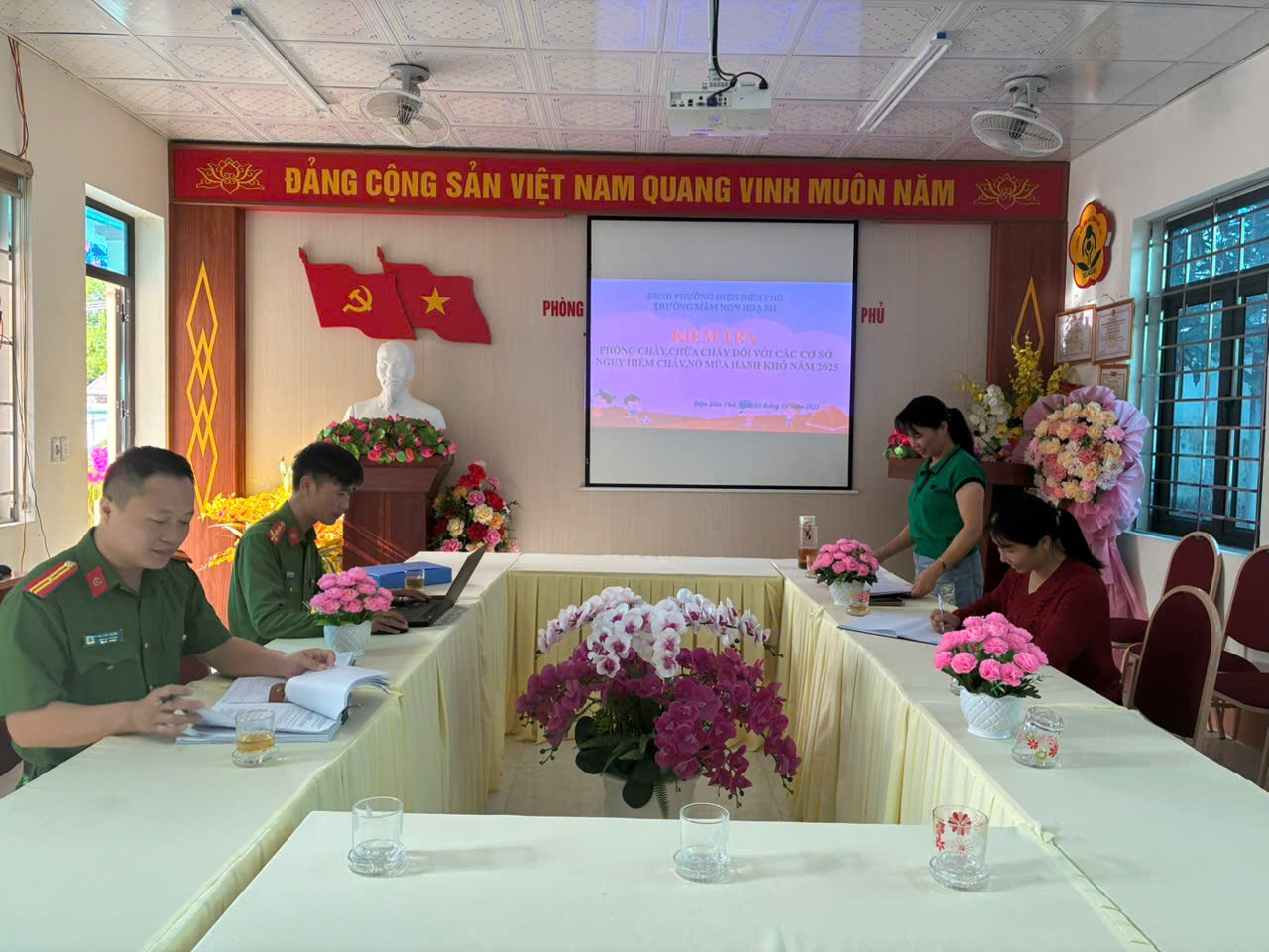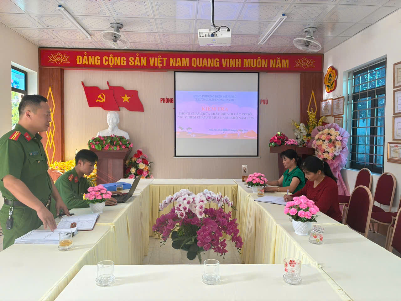 Thực hiện thông báo số: 1612/ PC07-TB ngày 30/10/2025 của Phòng cảnh sát PCCC&CNCH Công an tỉnh Điện Biên V/v về kiểm tra định kỳ công tác PCCC tại các cơ quan, đơn vị, trường học năm 2025. Sáng ngày 05/11/2025, trường Mầm non Họa Mi, phường Điện Biên Phủ vinh dự đón đoàn kiểm tra của Phòng Cảnh sát PCCC và CNCH Công an tỉnh Điện Biên kiểm tra định kỳ về PCCC năm 2025